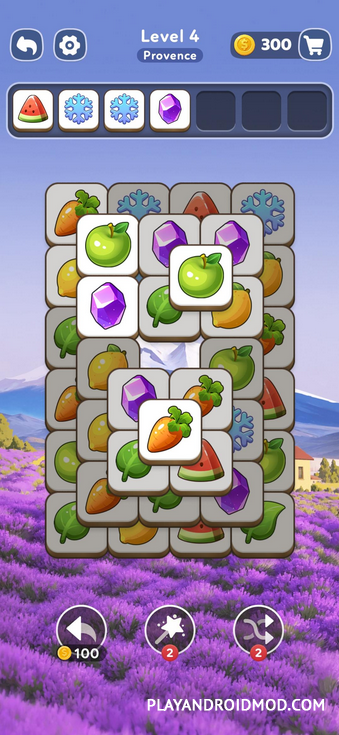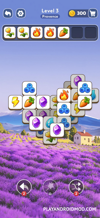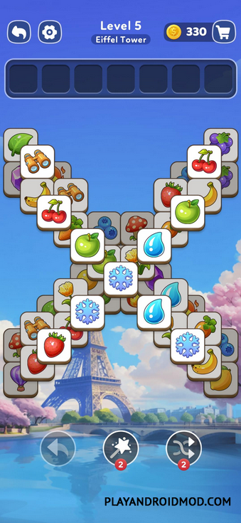 Плитки расположены на экране в виде различных фигур. Сложность заключается в том, что эти плитки расположены друг на друге. Наверху экрана вы увидите 7 свободных ячеек, куда можно перемещать плитки. Ищите одинаковые детали и группируйте их так, чтобы не попасть в тупик.