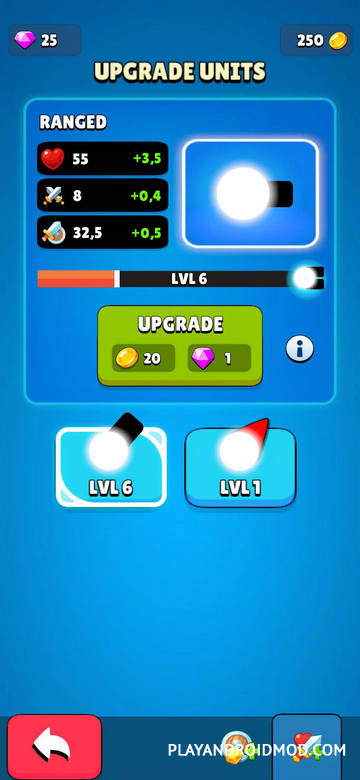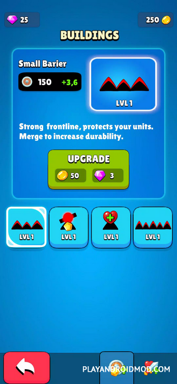 Defender Merge позволяет прокачать стратегические навыки в игровом режиме. Основная цель: создать линию обороны (защита и база) против бесконечных волн врагов. Пользователь самостоятельно решает какие необходимы улучшения и объединения, в какой момент их использовать. Но все это сильно влияет на схему игры и сложность прохождения. Поэтому стоит быстро принимать решения, чтобы скорее добиться положительного результата. Особое внимание стоит уделить улучшениям: при правильном выборе они помогают сильно ослабить врагов и усилить оборону на несколько пунктов. Еще один момент: враги на каждом уровне становятся сильнее. Поэтому стратегию и схему обороны вместе с улучшениями необходимо постоянно совершенствовать.