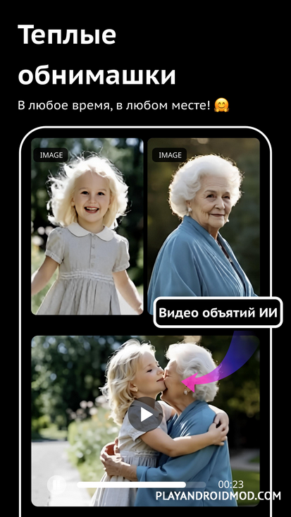 Изображения двух людей можно объединить, запечатлев момент поцелуя. Алгоритмы ИИ гарантируют высокое качество и реалистичность. Кроме этого, имеется возможность создавать объятия, делая людей ближе друг к другу.