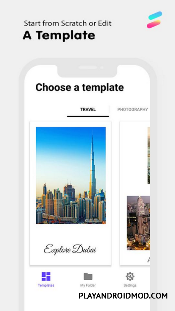Просто выберите шаблон и настройте его свою идею. На выбор доступны анимированные шаблоны нескольких категорий: видео, текст, фото. Каждый из них можно настроить, добавив текст понравившегося стиля и цвета. Также есть возможность наложить музыкальный трек и добавить медиа, с которыми вы хотите создавать свои шедевры.