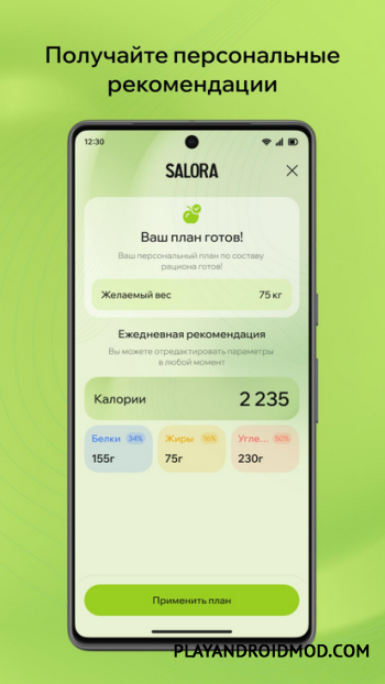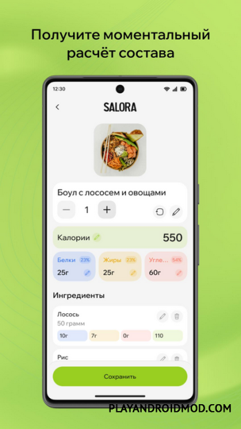Salora - это простой и очень точный счетчик калорий, который оценивает блюда по фото с помощью сверхточных нейтронных сетей. Они не только определяют его состав, но и размер. Утилита, способна «разобрать» на составляющие даже супы, выпечку и другие довольно сложные блюда с визуально скрытым составом с точностью 96,7%. Достигается такой высокий результат за счет интеграции искусственного интеллекта, который на основе подсказок пользователя подбирает подходящие варианты. Остается только выбрать нужный и информация о его калорийности, количеству белков, жиров и углеводов уже через секунду отобразится на экране мобильного. Используя эти данные вы сможете самостоятельно корректировать свой рацион в зависимости от целей и желаний.