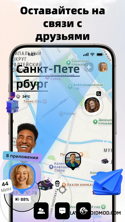 Jagat ― приложение, позволяющая держать связь с родственниками, друзьями и близкими в реальном времени. Это повышает комфорт и безопасность общения, взаимодействия и выводит все на новый, искренний уровень доверия. Пользователи смогут видеть на карте местоположения добавленных контактов, уровень заряда его телефона и другие параметры. Также можно писать сообщения, слать смайлики и взаимодействовать другими способами. Можно создавать сообщества, активировать видеосвязь, голосовые звонки и аудиосообщения, и много всего еще. Встроенные функции местоположения позволят всегда знать где, кто находится и чем занимается и делиться информации о себе с остальными. При этом, ничего не мешает отключить эту функцию или открыть только отдельным людям, тут нет ограничений.