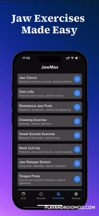 JawMax немедицинское приложение! Все советы, которое оно дает направлены исключительно для оздоровления, и не помогут решить какие – то серьезные проблемы. При любых осложнениях стоит обратиться к врачу! В приложение встроено ИИ, которое позволяет просканировать линию челюсти и шеи, и объективно оценить эстетику этих мест, какие есть проблемы. И исходя из полученных данных, приложение дает легкие упражнения (текстовое и видео описание), которые позволяют скорректировать линию челюсти и шеи. После выполнения можно заново провести сканирование, чтобы оценить как действует упражнение, какой прогресс есть на данный момент и какое место в эстетическом, немедицинском, рейтинге по приложению занимает пользователь.