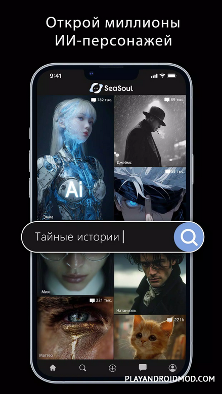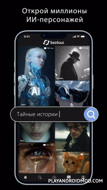Sea Soul: AI Chat позволяет пользователю погрузиться в общение с любимым персонажем, создавая с ним уникальные истории. Библиотека персонажей очень большая и постоянно пополняется разработчиками и сами пользователями. Встроенное ИИ позволяет общаться с выбранным персонажем как с живым человеком (эмоциональные реакции будут практически такими же, как у обычного человека) на любые темы, которые не запрещены действующим законодательством. Ограничений на количество сообщений нет. Дополнительно можно изучать чужие истории, находить друзей и находить новые темы для общения. Дополнительно в приложении можно генерировать разнообразные изображения или видео, достаточно ввести текстовую команду.